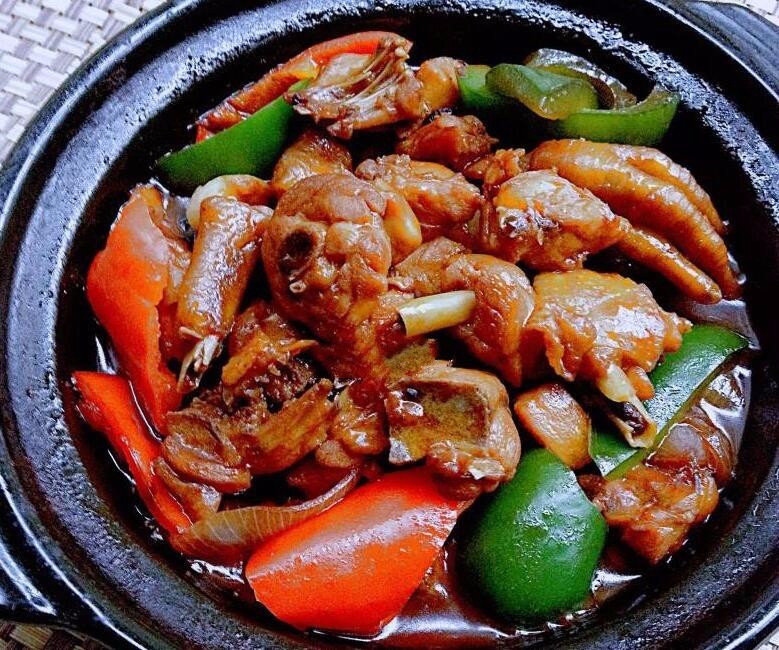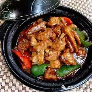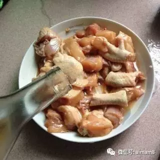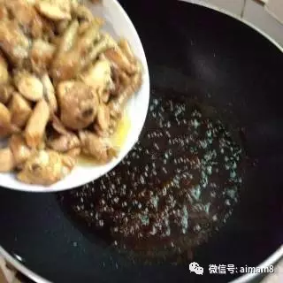 然后倒入炒好的鸡块,上面淋入适量的料酒,盖住焖烧三五分钟即可