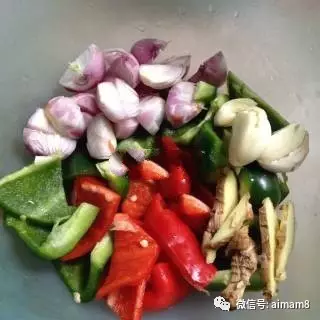 将洋葱去皮切开、姜切片、蒜拍扁、青红椒切块备用