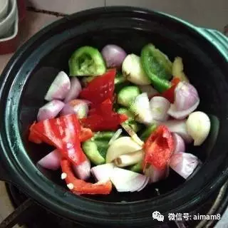 准备砂锅放一勺油,加热放入姜、葱、蒜、青红椒爆出香味